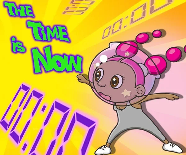“With an aesthetic reminiscent of a mobile game or cartoon series, The Time Is Now touches on both playfulness and anxiety. A Cartoon Network-style version of the artist appears in a space helmet, visibly alarmed. Zeroed-out clock digits drift through the air, with time appearing either frozen, slipping away or even non-existent.