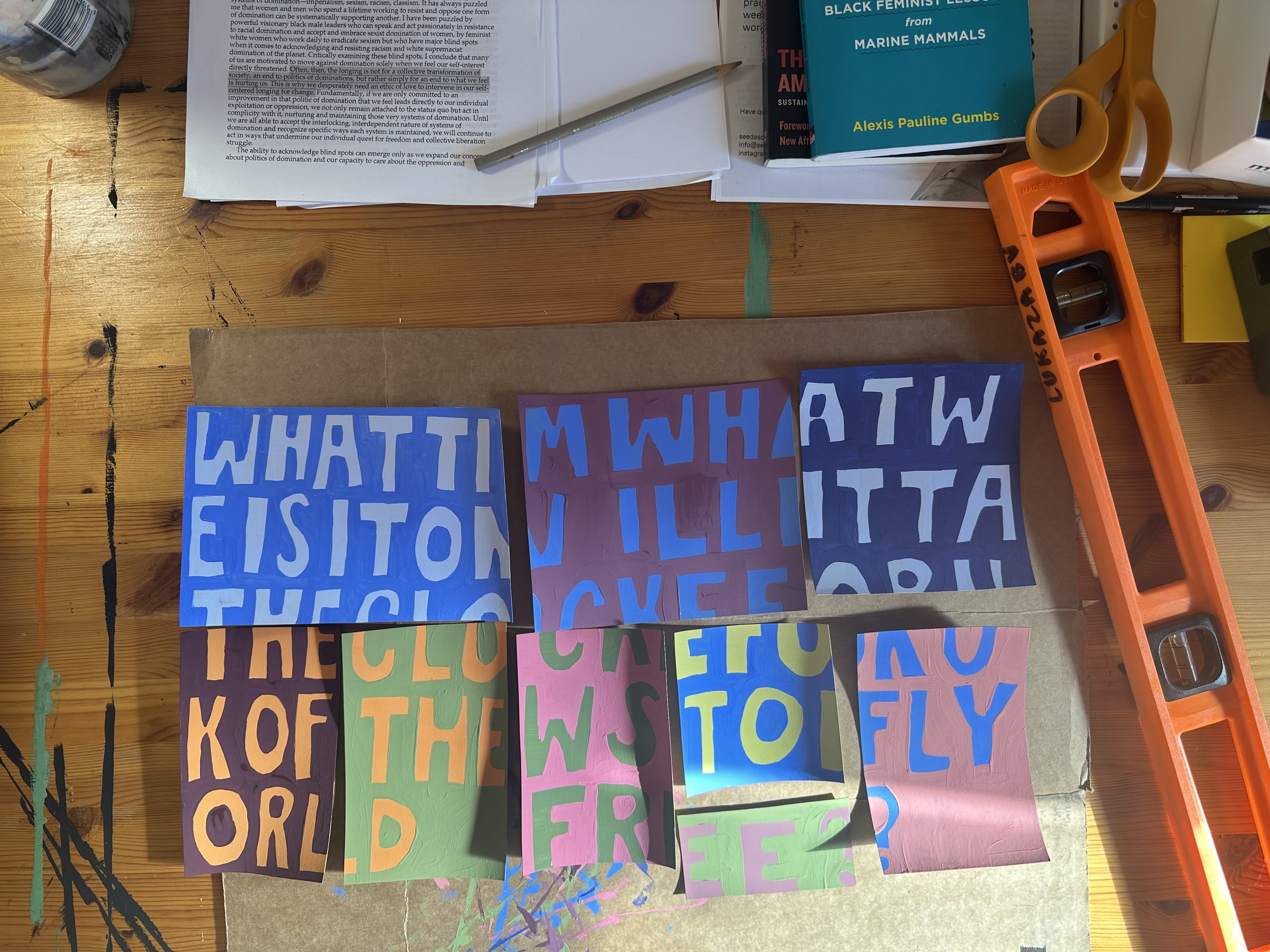 These two questions are in dialogue with seven answers by seven Black writers, artists and activists, who expand and pull us into a weaving of ways that we imagine and center Black futures. (Documented in the work-in-progress photos above. Reference texts can be found below.) Branfman-Verissimo carefully selected these seven answers from their library and archive; lines from treasured books, poems, paper taped to their studio wall, studied texts and the words that they keep close to their heart.